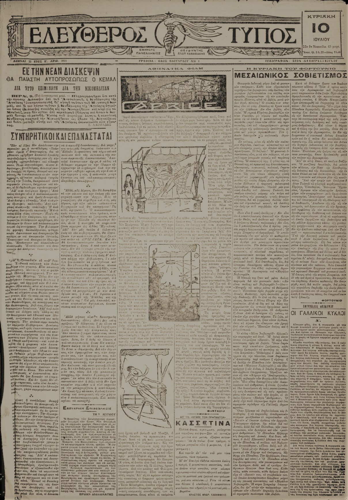Η συνεχιζόμενη διάσταση απόψεων μεταξύ Αγγλίας και Γαλλίας για το Ανατολικό, οδηγεί σε αναβολή αν όχι ματαίωση της προαναγγελθείσας Διάσκεψης στο Μπέϊκοζ ή όπου αλλού. Η κυβέρνηση βρίσκεται αντιμέτωπη με την αναγκαιότητα αλλαγής πολιτικής. Το σχέδιο της αυτονόμησης της Μ. Ασίας εγκαταλείπεται οριστικώς, η κοινωνία έχει φτάσει στα όριά της και το ζήτημα της οργάνωσης των φασιστών και στην Ελλάδα, που αναδεικνύεται σχεδόν καθημερινά από συγκεκριμένη εφημερίδα, έρχεται να προσθέσει ένα ακόμη πρόβλημα στα τόσα που αντιμετωπίζει ο λαός…