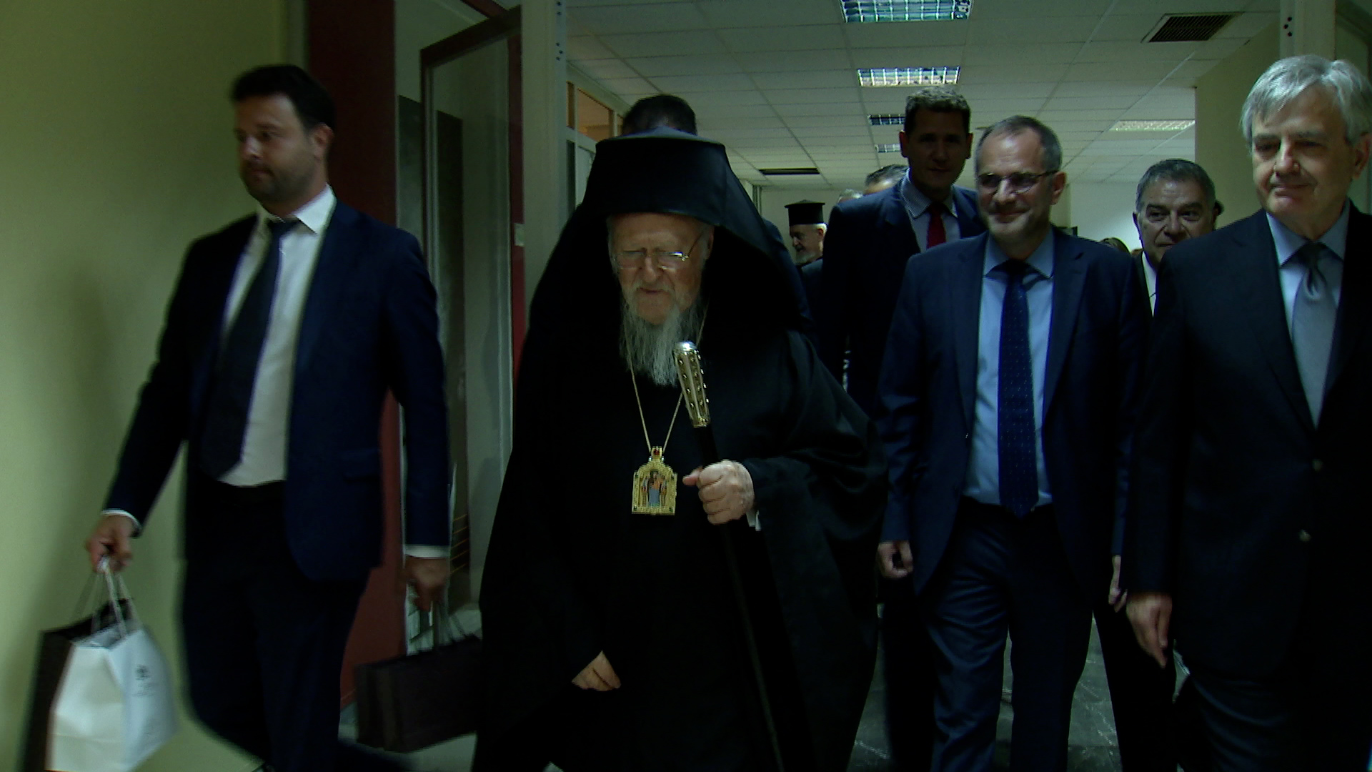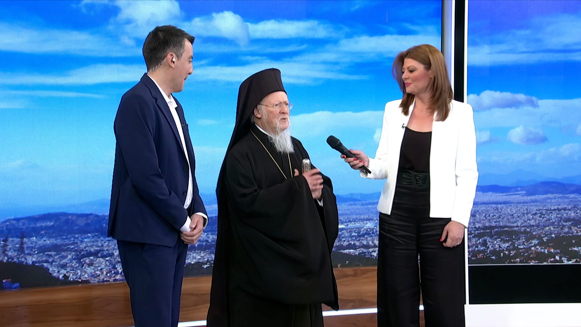 Κατά τη διάρκεια της ζωντανής εκπομπής «Συνδέσεις» ο Οικουμενικός Πατριάρχης διέσχισε το στούντιο και με αυθορμητισμό χαιρέτησε παρουσιαστές και τεχνικούς.