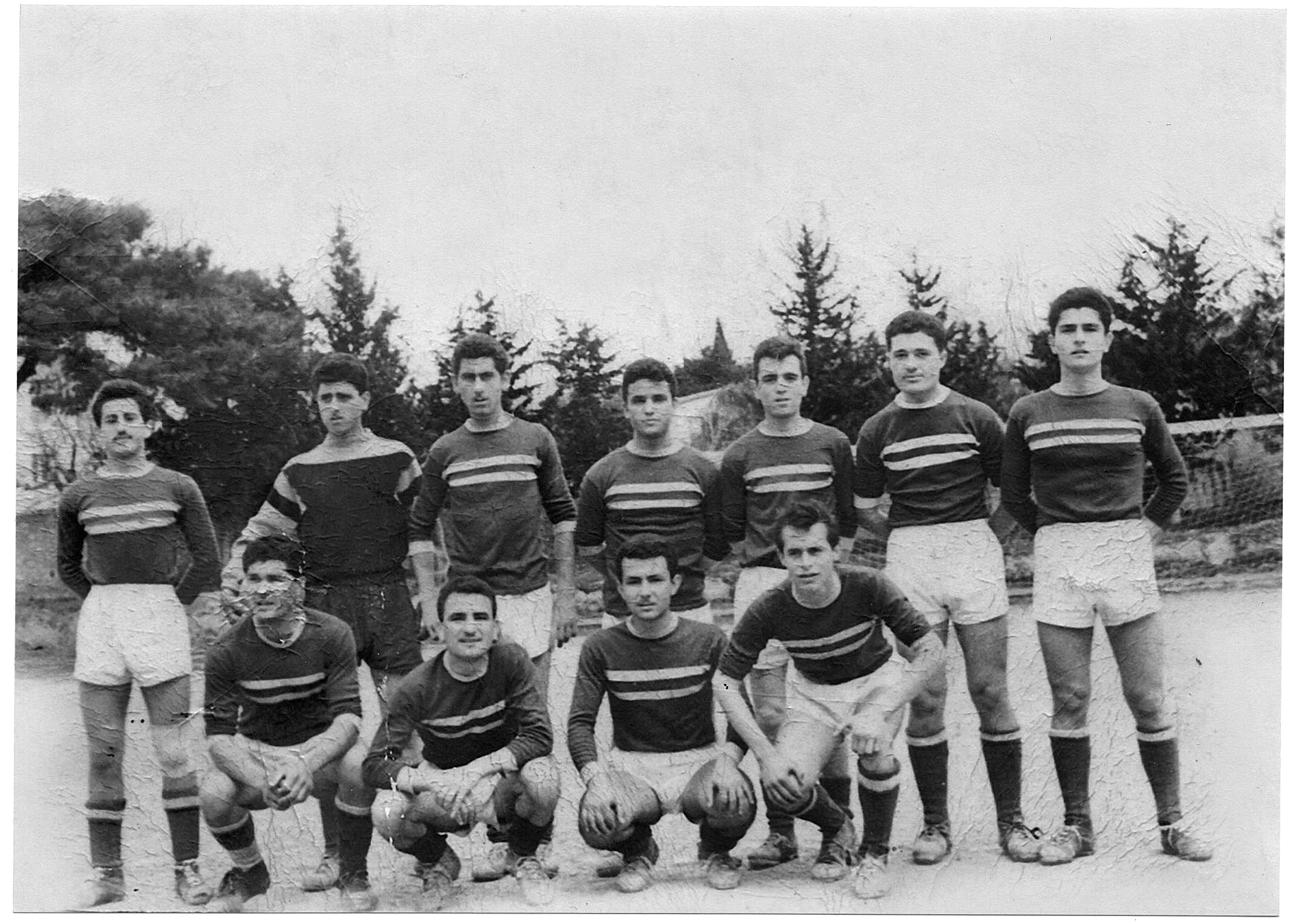 η β’ ομάδα του Προμποναϊκού στο πρώτο μισό της δεκαετίας του 1960, με τον Γ. Ουσταμπασίδη πρώτο όρθιο από δεξιά, φωτο στην αλάνα της Ριζούπολης. Προσέχουμε τα χαλίκια στον αγωνιστικό χώρο, αλλά και τον χαρούμενο πιτσιρικά που απολαμβάνει τη στιγμή