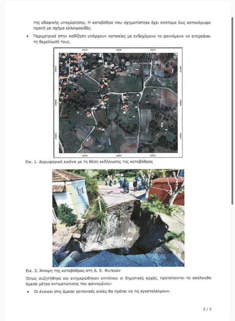 – Στη θέση, σημειώθηκε φρεατοειδούς μορφής εδαφική υποχώρηση (καταβόθρα) πλάτους 6×10 μέτρα και βάθους 7 μέτρων.